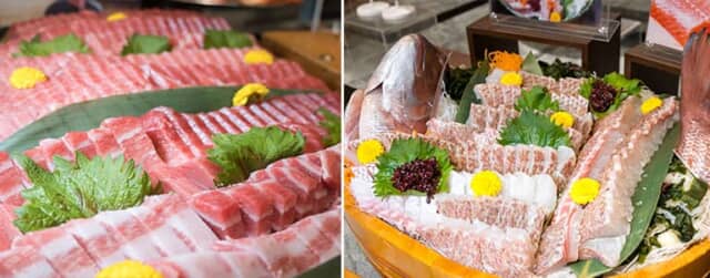 お造りも、脂ののった天然本まぐろの赤身や中トロなど数種類並ぶほか、鯛の舟盛りなど豪華メニューがそろいます。
