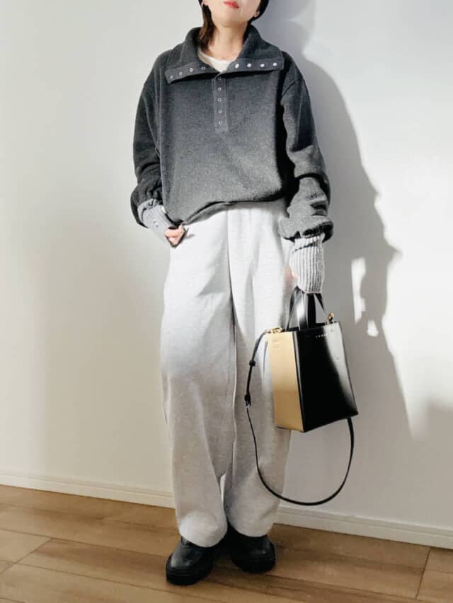 スウェットパンツと合わせれば、リラックス感がありつつもカジュアルに寄りすぎません。襟を立ててタートル風に着れば、防寒しながら顔まわりの印象もシャープに。レザーバッグやレザーシューズを合わせれば、きちんと感が加わって大人っぽさが増します。