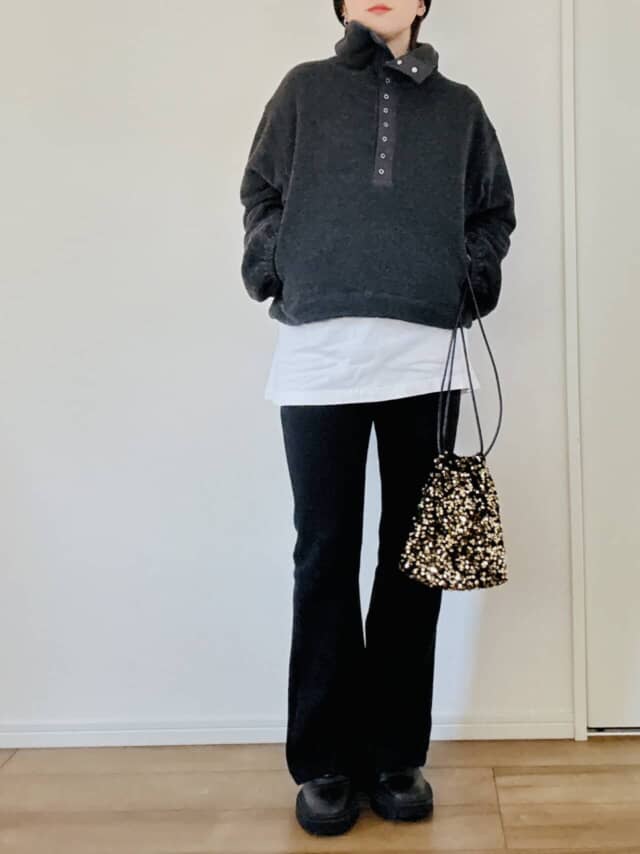 フリースはどうしてもスポーティに寄りがちですが、ボトムスを黒・グレー・ブラウンのスラックスにするだけで印象が一気に大人っぽく整います。