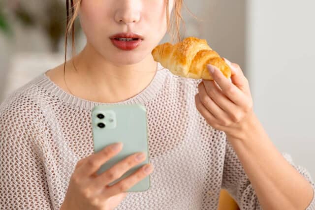 スマホを触りながら食べていると、脳が「食事をした」という感覚を十分に処理できず、満腹を感じにくくなる傾向があります。すると、皿に残っているパンをついもうひとかじり、サラダを少し足し…と、無意識のまま食べる量が増えることに。