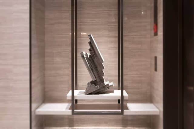 陶芸家の竹内紘三氏による、石板を重ねたような作品「現代の遺構」は、朽ちた建物が醸し出す儚さや美しさを表現。世界有数の最先端の街でありながら、古き良き街並みが残る銀座を表わす作品です。