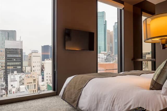 床から天井までタテに長く都会の風景を切り取る窓もドラマチック。客室の向きによって窓の景色は異なりますが、写真は新橋駅方面の眺望です。
