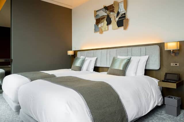 31.3平米の「スーペリアコーナーツイン」はその名のとおり角部屋にあって、2方向に窓がある開放的な客室です。リビングスペースにはソファーとテーブルが置かれ、上層階の客室なら都会の眺望を楽しめます。
