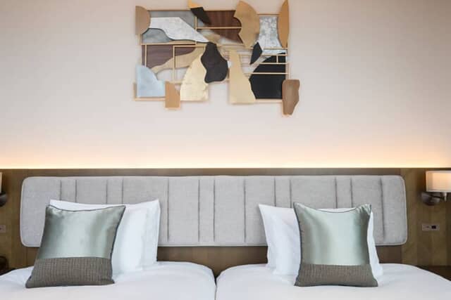13階に2部屋ある「エグゼクティブツイン」は、リビングとベッドルームがセパレートした最も広い客室です。2名まで利用できる客室としては大きなソファーセットも置かれ、ゆったりとした時間を過ごせます。