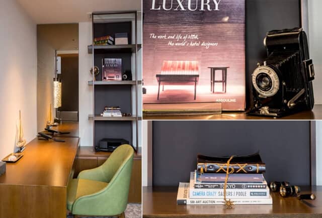 奥まった位置にデスクが置かれ、リビングの寛いだ雰囲気を邪魔しない間取りです。棚にはアンティークの蛇腹カメラやオペラグラス、アートについての書籍が置かれ、広いデスクにもヨットの模型が飾られるなど、ビジネスエリアにアットホームな雰囲気を添えています。緑色の椅子がアクセントカラーになっていました。