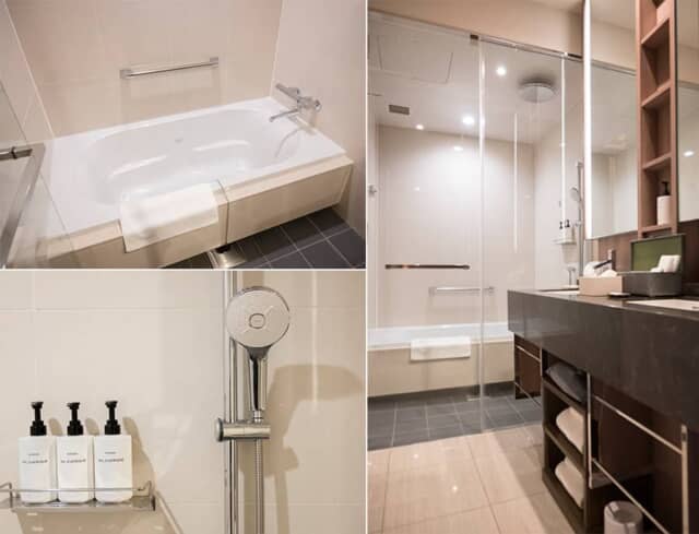 ガラス張りのバスルームには、グローエ社のハンドシャワーとレインシャワーを設置。バスアメニティーはスウェーデンのフレグランスブランドBYREDO(バイレード)の「Bal d’Afrique(バルダフリック)」シリーズで、マリゴールドやベルガモットの香りと共にバスタイムを楽しめます。ボディソープはしっとりした使い心地。シャンプー・コンディショナーはしっとりとサラリの両立で、ドライヤーの後髪が柔らかになる優れものでした。
