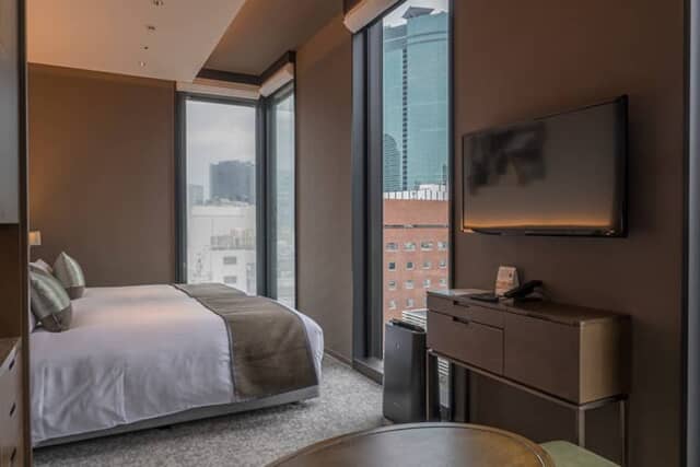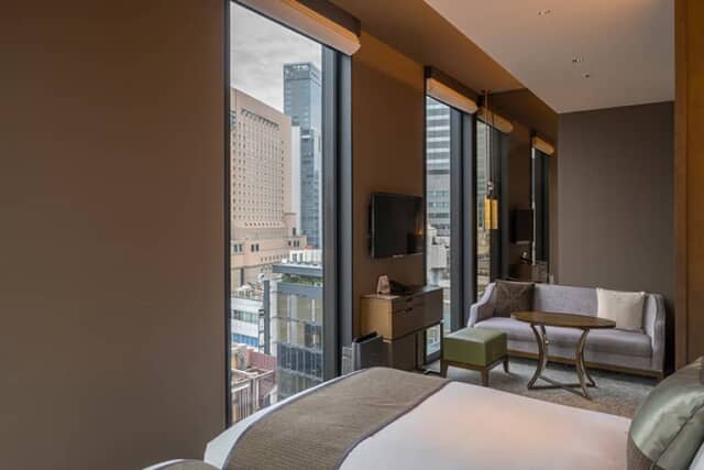 客室はスーペリアクイーン、デラックスツイン、そして最も広いエグゼクティブツインなど5タイプ104室を用意。ベージュの壁色とダークブラウンの木材が使われた重厚で上質な客室。天井高が3.1mもあり、床から天井近くまである掃き出し窓が、都会の風景を切り取っていました。