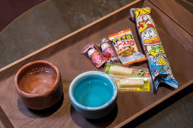 ラウンジには駄菓子も用意。この日は夕食前のアペリティフとして利き酒を楽しみました。