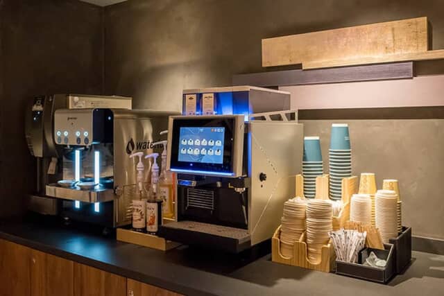エスプレッソやデカフェラテなど11種類のコーヒーやココアから選べます。「La Tradition」のコーヒー豆は深焙りのブレンドを使用。トロピカルジュースのシロップや、ミネラルウォーターと炭酸水のサーバーもあって、ドリンクを割って楽しめます。