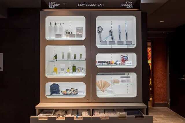ロビーの一角にある「STAY SELECT BAR」には、客室に備えるReFaのシャワーヘッドやバスアメニティーなど質の高い日本製品が飾られていて、気に入ったものは購入も可能。棚の下の引き出しにはアメニティが並んでいて、必要なものを持参します。