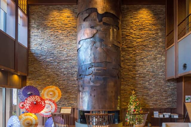 北海道のホテルでは吹き抜けに吊られた大きな暖炉に出会うことがよくありますが、ホテル万惣は異色作。金属造形作家の伊藤嘉英氏が、江戸時代末期に開港した函館をモチーフに、暖炉を銅板で覆った『今様文明開化絵巻』を制作。函館山や今も街に残る擬洋風建築、湯の川温泉の黒松林などが彫刻され、ホテルのコンセプトにも通じる函館の歴史や文化を表現しています。