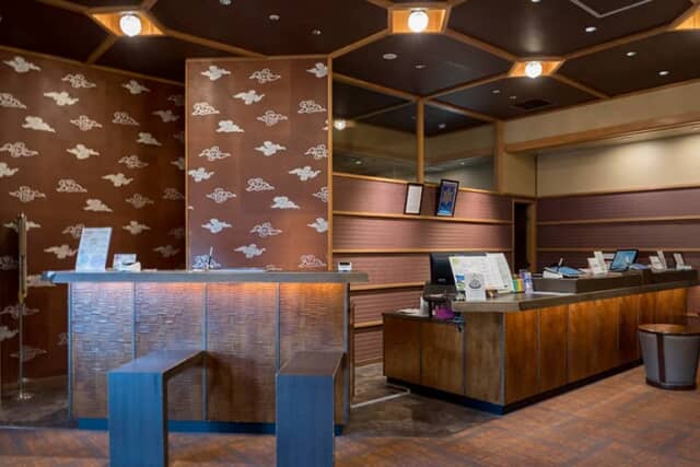 フロントデスクとそのまわりは木の風合いを活かしたビンテージな和風感。
