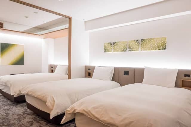 ベッドマットはシモンズとホテルのオリジナルモデルで幅120cm × 長さ200cmが2台と、引き戸で閉めることができるスペースに幅160cm × 長さ200cmのダブルベッドが1台置かれます。特にマットレスの上に敷かれたマットレストッパーは厚手でふかふか。布団感覚で眠れます。