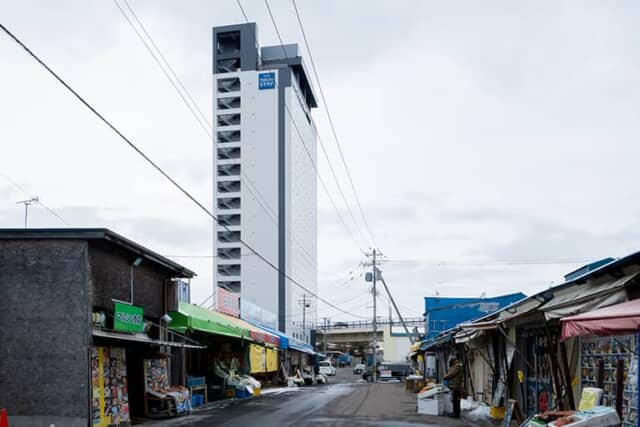 JR函館駅からは函館朝市を通り抜けて徒歩4分ほど。車利用の人はホテル横にある「函館朝市駐車場」を利用して、チェックイン・チェックアウトの15時から翌11時まで¥1,000。特に早朝から賑わう朝市がすぐ目の前にあるのはとても便利です。