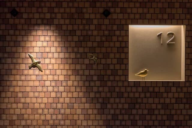 函館の街に今も残る赤レンガ倉庫をイメージしたエレベーターホールの意匠。カモメのレリーフも港町らしい雰囲気です。