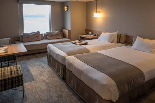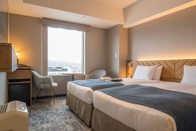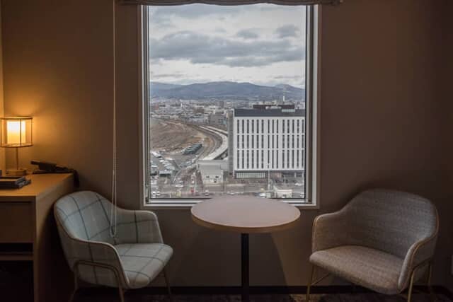 窓際にはテーブルと2脚の椅子を配置。高層階の客室からは函館駅の構内も見られ、部屋の位置によっては湾曲した特徴的な駅のホームや五稜郭タワーが見られます。遠くには亀田半島の山々も見えました。