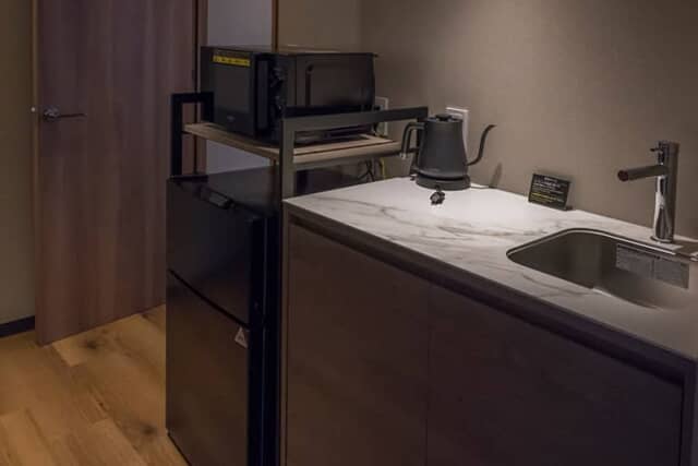 コーナーツインをはじめ、スタンダードツイン、ラグジュアリーツインの客室にはミニキッチンを備え、調理道具もそろっているので簡単な料理も作れます。