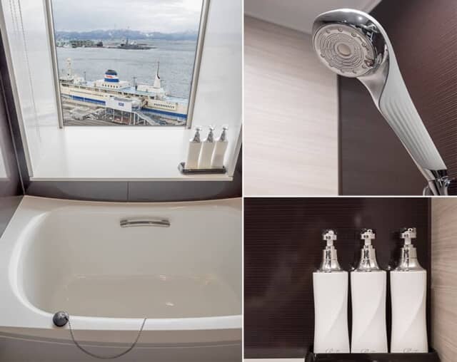 コーナーツインのバスルームからは函館港や青函連絡船を見られる贅沢な作り。全室にリファのシャワーヘッド(ReFa FINE BUBBLE U)を備え、ReFaビューテックシャンプーとトリートメント、ボディソープにはテンションが上がります。翌朝髪はサラサラでフワリ。保湿感もしっかりあるハイクオリティな製品です。