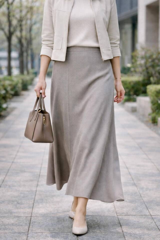 以前は定番だったハリのあるフレアスカートですが、今はシルエットが大きく広がるほど重心が下がって見えやすく、全体がやや古い印象になりがち。2026春は、歩くと揺れるのに横に広がらない、落ち感素材のフレアやIライン寄りのシルエットが主流です。