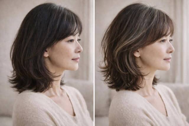 白髪と共存するヘアでは、カラーだけでなくカットのバランスも重要です。重すぎるシルエットや、動きのないスタイルは、白髪のコントラストを強調しがち。2026年は軽さを出しすぎず、自然な動きが出るシルエットが好相性。レイヤーや顔まわりの設計で空気感をつくることで、白髪があっても全体の印象はぐっと若々しく整います。