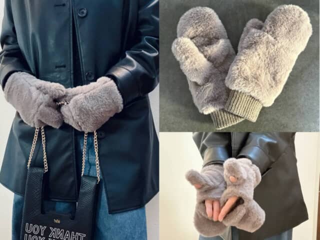 可愛らしい印象が強いミトンは、色選びと合わせ方が鍵。グレーやブラックなど落ち着いたカラーを選べば、40代以降でも無理なく取り入れられます。