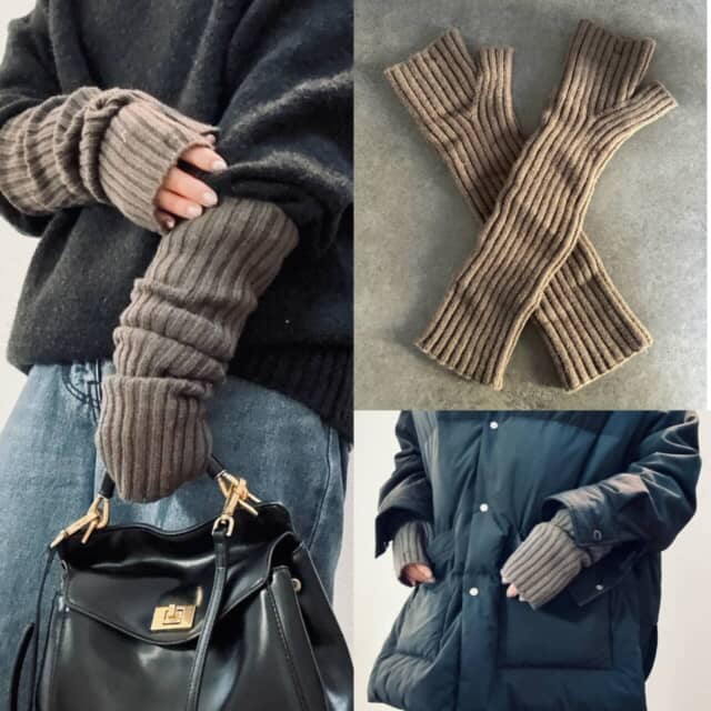 肘下まで覆う長めの設計と、くしゅっとした生地感がポイントで、指先が開いたデザインはスマホ操作にも便利。タートルに重ねたり、シャツやニットから少し覗かせる使い方なら、甘すぎず大人にちょうどいいバランス。“ちょい見せ”で奥行きが出て、脱・手抜き見えを叶えます。