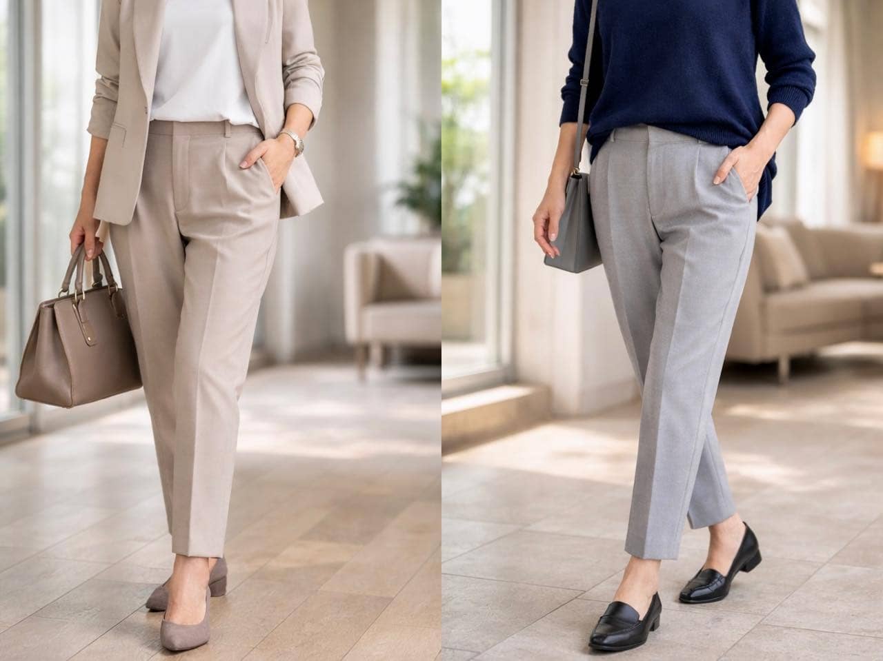 特にローヒールやフラットシューズと合わせる場合、丈が長すぎると一気に野暮ったい印象になりやすくなります。くるぶしがほんのり見える程度、もしくは足の甲がきれいにのぞく長さを意識するだけで、パンツ本来のシャープさが引き立ちます。