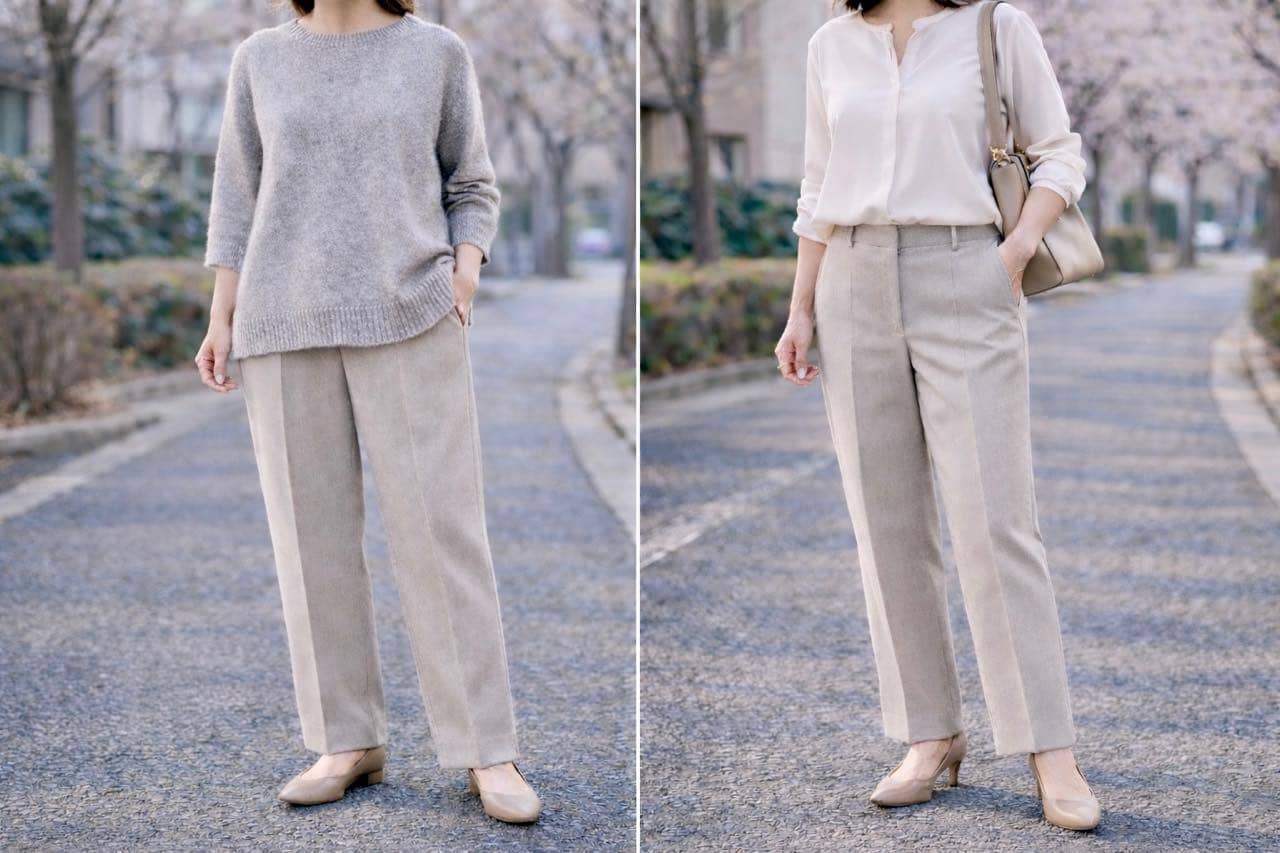 きちんと見えて脚もすっきり見せてくれるセンタープレスパンツは、40代・50代の強い味方。ただ「思ったほど脚が長く見えない」「なんだか野暮ったい」と感じることはありませんか?その差を生むのが“腰位置の見せ方”。同じパンツでも、着こなし次第で美脚効果は大きく変わります。