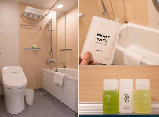 洗面は客室にあるので、その分お風呂には少しゆとりがありました。シャンプー類は緑茶の香りがほのかに広がるしっとり系の「トリプルC」で、ちょっと嬉しいミニボトル入り。さらにコンディショニングブランドを展開するAuBの入浴剤もプラン特典。5種類の生薬と2種類の温泉成分が配合され、少しぬるめのお湯にゆったり浸かって、ユズの香りに癒されるバスタイムを楽しみました。