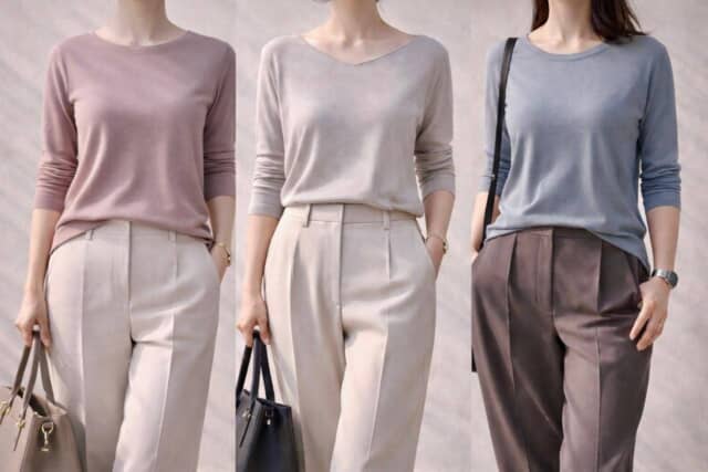 今っぽく見せたいなら、ネックラインにほんの少し広がりを。ボートネックや浅めのVネックなど、横や縦にわずかな開きがあるだけで、顔まわりに軽さが生まれます。少しだけ“余裕をつくる”ことがポイントです。