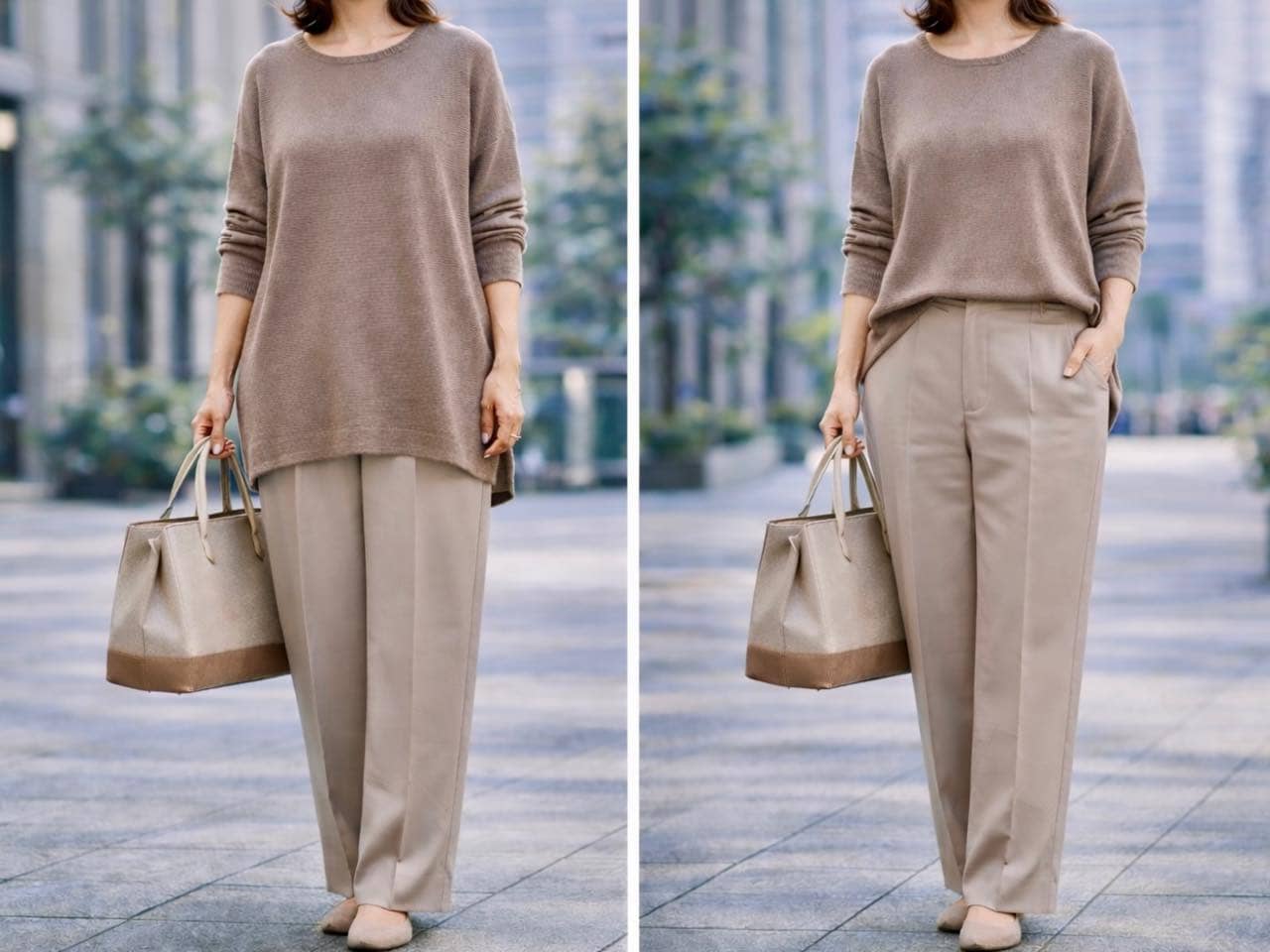 全身を覆うようなゆったりシルエットは、一見すると体型を隠してくれる安心感があるはず。しかし上下ともに余裕のあるラインを選ぶと、体の位置が分かりにくくなり、全体が平面的に見えやすくなり、結果的に動きの少ない重たい印象につながることがあります。