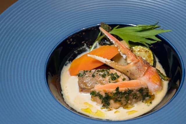 もう一方のメインプレートは「サーモンのグリル 白ワインソース」。身がたっぷりついたカニの爪はゴージャス感たっぷり。ズッキーニや人参などの野菜も味がしっかりしていて北海道の味を実感。肉厚のサーモンは、味に奥行きのあるホワイトソースにひたっていて、絶品の味を満喫しました。