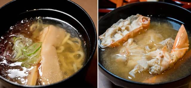 セルフで作るラーメンもありました。味は北海道三大ラーメンのうち、函館の塩ラーメン。一口サイズと小ぶりなので、お腹がいっぱいでも食べられます。さらに「カニ汁」も用意。濃厚な旨みを味わえます。