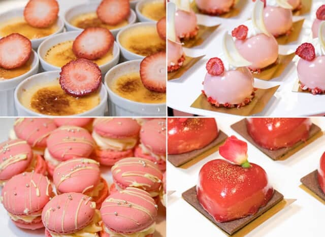 ライブキッチンで表面を炙る「ストロベリークレームブリュレ」や、可愛いらしいピンクの球体「フレーズ・フロマージュ」のほか、「ストロベリーマカロン」や中にショコラがたっぷり入ったハート形の「フランボワーズ・ショコラ」など、見た目もキュートなスイーツが並びます。