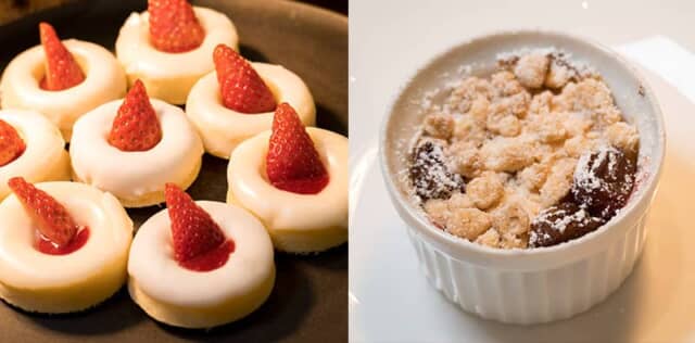 「グレーズド・ベイクドドーナツ」はアーモンドパウダーでしっとり焼き上げた焼きドーナツで、イチゴソースがかかります。カップに入った温かいストロベリーグラタンは、カスタードの中にラムレーズンやいちごなどが入り、カリカリのクランブルが飾られて心地よい食感を楽しめます。