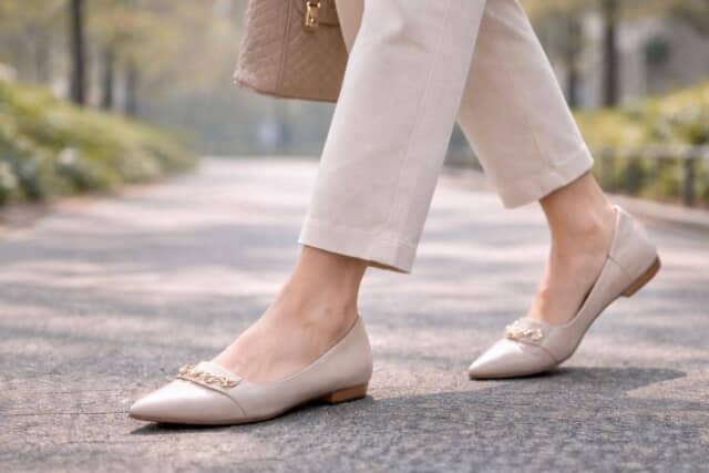 2026春は、甲が浅めでポインテッド寄りのシルエット、もしくは金具や切り替えのあるデザインがトレンド。ヒールが低くても足元がシャープに見えるため、通勤にも休日にも使いやすく、大人のワードローブに取り入れやすい一足です。