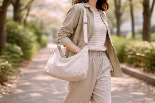 週末用バッグも、冬の延長で重たい素材や濃色を使い続けると、季節感がズレやすくなります。ナイロンやキャンバス素材でも、色味やデザインが控えめなものを選べば、大人のカジュアルにちょうどいい抜け感に。
