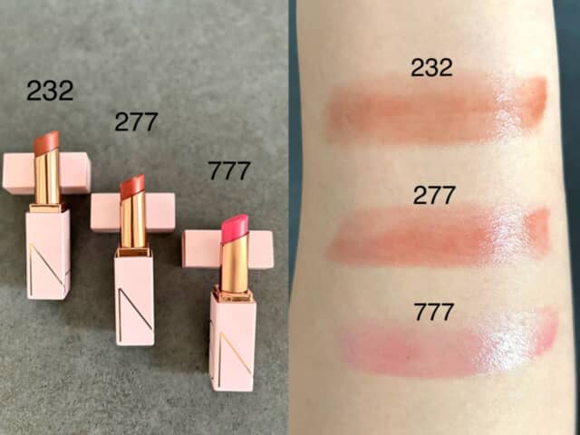 ▲NARS「アフターグロー リップバーム N」 全9色 各¥4,180(税込) / 232 ラテブラウン、277 レッドチェスナッツ、777 ピーチピンク&ゴールデンシマー