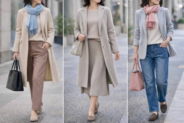 黒や濃紺を中心にした冬の配色は、どうしても重心が下がって見えます。2月後半は、ベージュやライトグレー、やわらかなトープなど、明るめの中間色をベースにすると全体が軽く整います。白ほど強くなく、黒ほど重くない色は、大人の肌にも自然になじみ、上品な印象をつくります。
