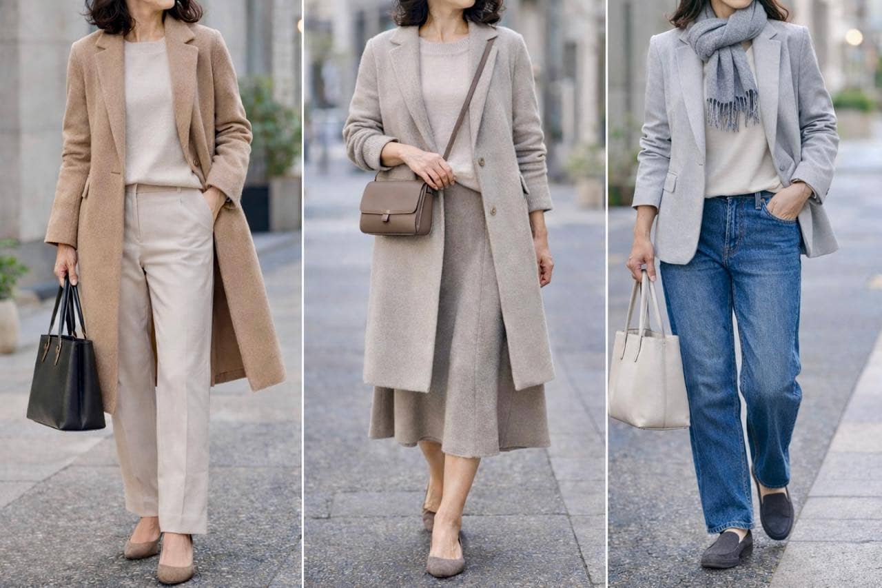 黒や濃紺を中心にした冬の配色は、どうしても重心が下がって見えます。2月後半は、ベージュやライトグレー、やわらかなトープなど、明るめの中間色をベースにすると全体が軽く整います。白ほど強くなく、黒ほど重くない色は、大人の肌にも自然になじみ、上品な印象をつくります。