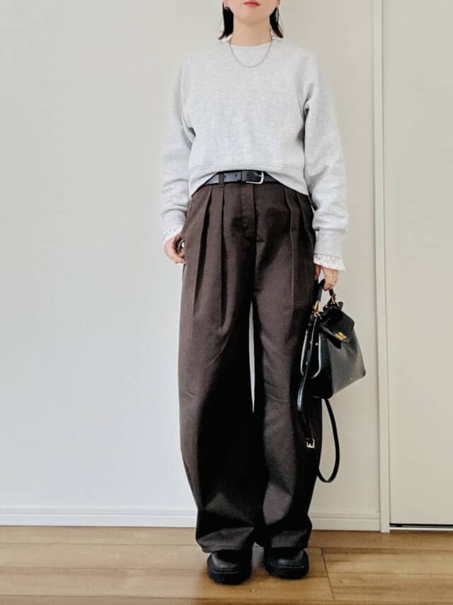 カジュアルなスウェット合わせでも、白のチラ見せやシルバーアクセを加えることで、ラフすぎない印象に。バッグやシューズは黒やダークトーンで引き締めると、大人のクラス感が高まります。