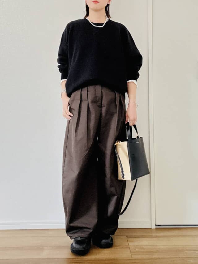 黒やブラウンなど落ち着いた配色の日は、白インナーをのぞかせたり、パールやシルバーアクセで光を足すと軽やかさが生まれます。
