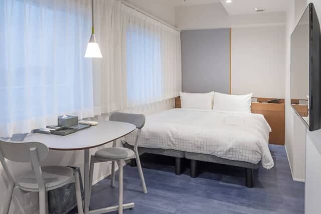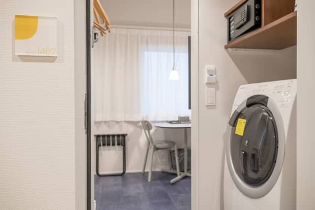 客室は6タイプ156室で、白を基調にヘッドボードやキャビネットなどに温もりのある木目を使用。全ての客室に電子レンジや2ドア冷蔵庫、洗濯乾燥機を備え、食べ物などをこぼしても拭きとれるように、床はビニール素材になっています。レジデンシャルダブルとスーペリアダブル、ユニバーサルの3室にはIHクッキングヒーターもありました。