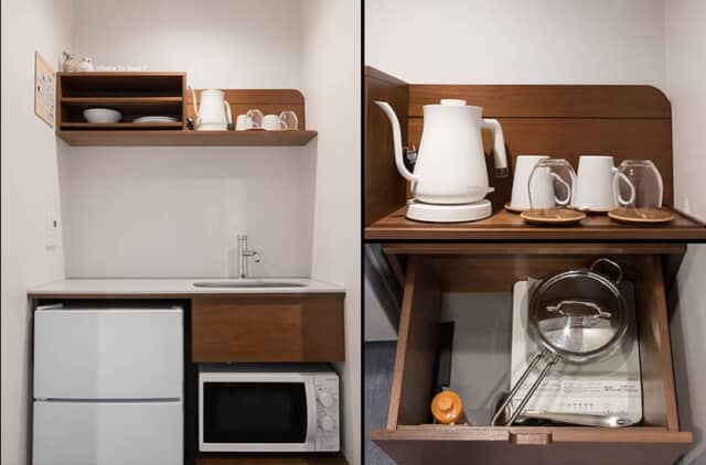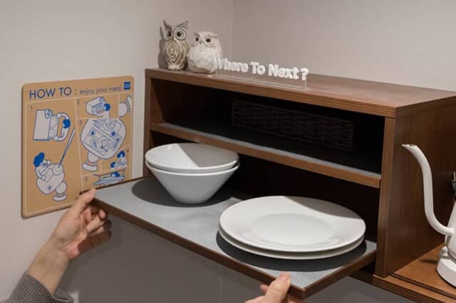 キッチン付きの客室には、IHクッキングヒーターや鍋、まな板、箸、洗剤などをそろえているので、食材を買い込んで簡単な料理を作れます。2ドアの冷凍庫には冷凍食品も入れられるのは嬉しいですね。