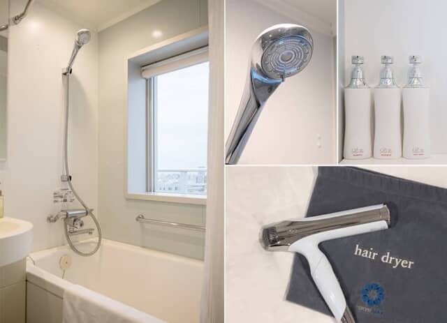全ての客室にReFaのドライヤーBEAUTECH DRYER SMART Wと、4つの水流を切り替えられるReFa FINE BUBBLE Uのシャワーヘッド、さらに髪の洗い上がりがよく髪の毛もよくまとまるReFaビューテックシリーズののシャンプー、トリートメント、ボディーソープをそろえているのも魅力です。さらにスーペリアダブルとユニバーサルはバスルームに窓があり、都会の景色を見られます。