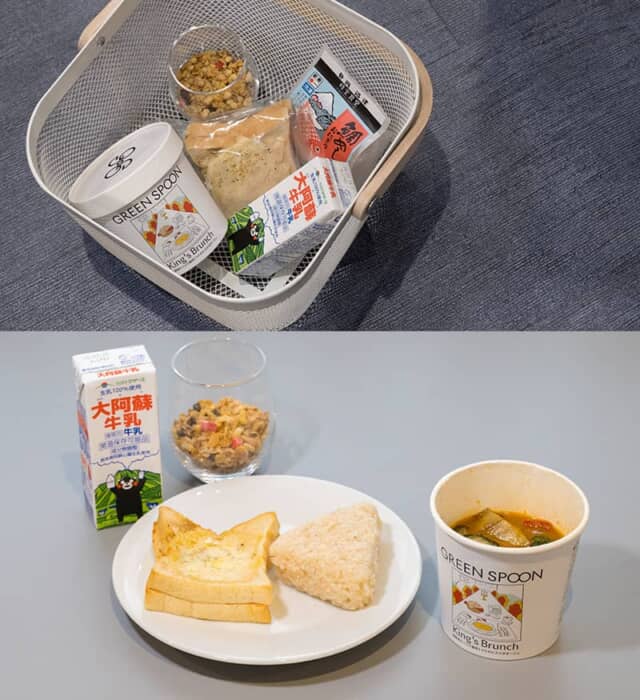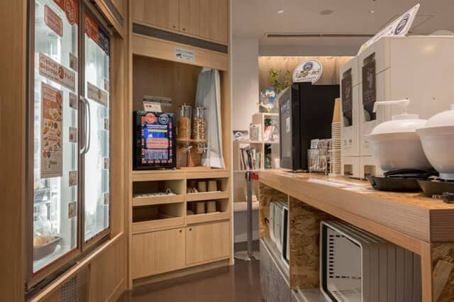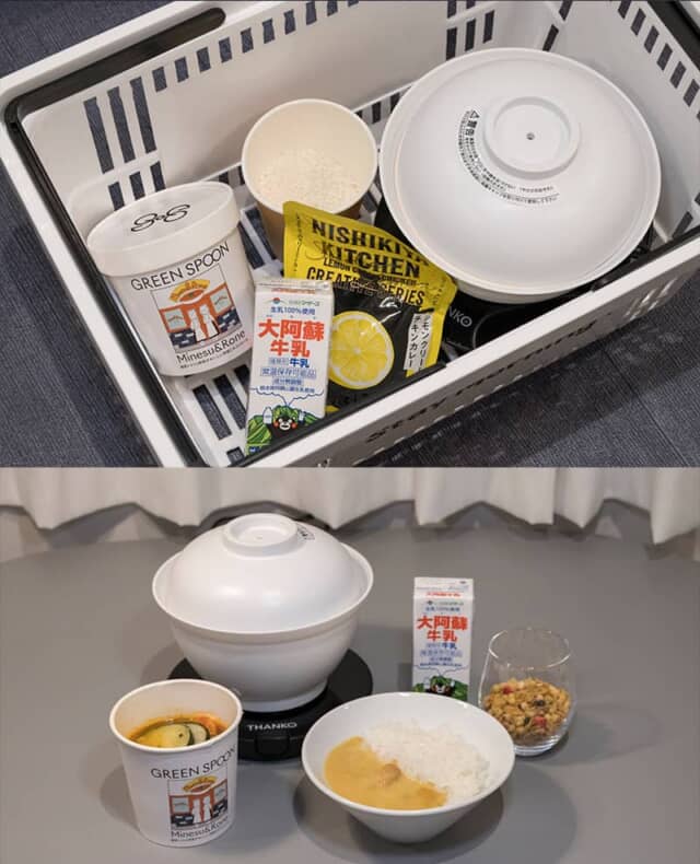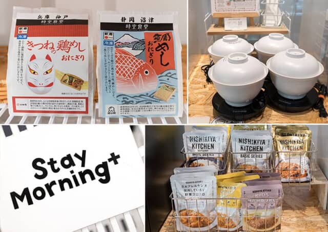 1階ロビーにあるステイモーニング+コーナーにお米や高品質の冷凍食品などが用意され、「お手軽セット」か「どんぶりセット」のどちらかを選び、部屋のレンジで調理します。全てのセットにシリアルとミックスナッツ、牛乳のほか、水を入れてレンチンするだけで本格的な味を楽しめる「GREEN SPOON」の冷凍スープがついています。