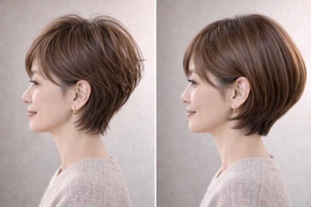 軽さを出して若々しい印象に見せたいならショートヘア。やわらかく整った印象をつくりたいならショートボブ。どちらも重要なのは、重さを増やすことではなく、シルエットの重心を整えること。トップ、後頭部、毛先のバランスが揃うと、印象は自然と若々しくなります。