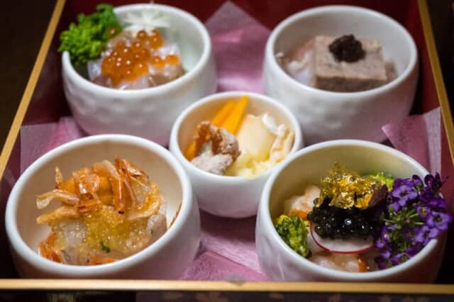 壱の重は「田舎風パテとボローニャハム」や「オマール海老とブロッコリーのマリネ キャビア」「本鮪と帆立貝のマリネ」など、艶やかな彩りの5品の料理が並びます。