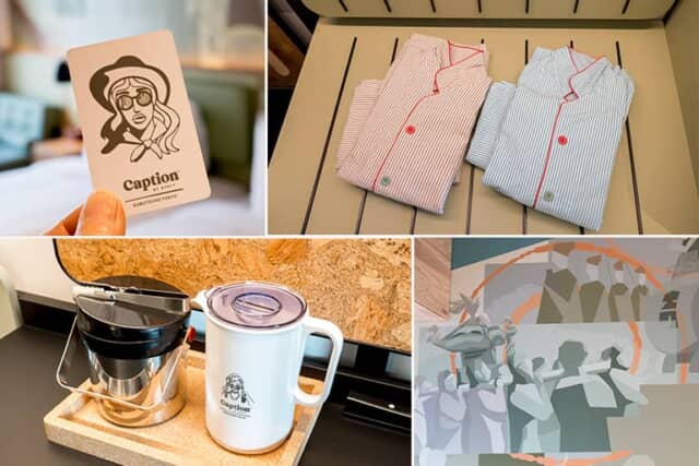 カードキーや水を入れるピッチャーには、サングラスをした人物のイラストが描かれています。こうしたイラストが様々な場所に登場するので、発見するたびに嬉しい気分に。パジャマも可愛らしいストライプデザインで、滞在を楽しむアクセントになりました。