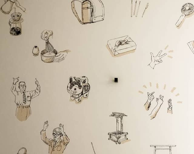 ウェットエリアもイラストの宝庫。かっては株の売買で活躍した手サインや、商売には欠かせない縁起物の張り子の犬。古い井戸や抹茶を点てる様子など、日本の今昔が描かれていました。